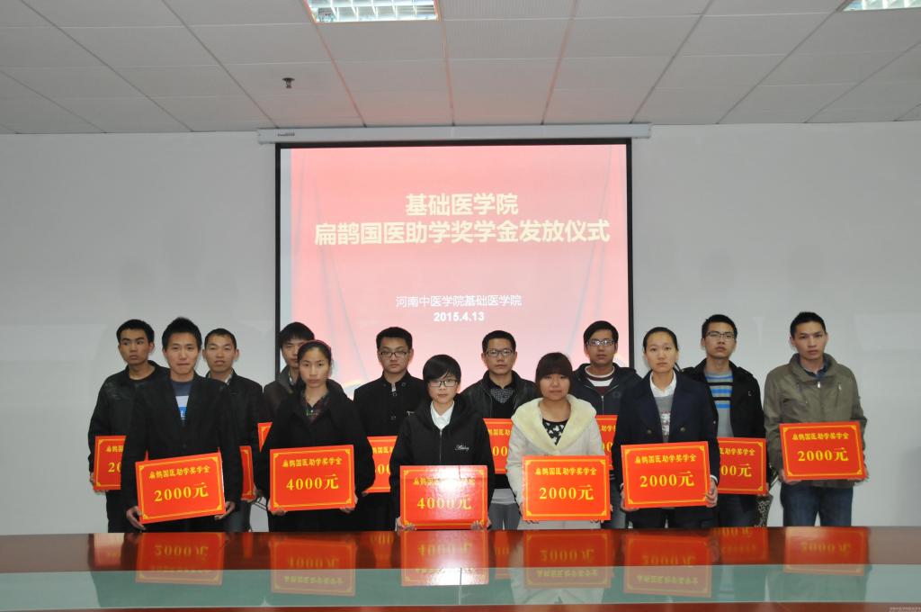 “扁鹊国医助学奖学金”由郑州中坤电力有限公司在河南蘑菇视频中医学专业(仲景学术传承班)设立,意在弘扬祖国中医药文化的传承和发展,倡导学生学习之正气,励行奉善行道、帮扶助人之美德,主要用于资助仲景学术传承班成绩特别优异、家庭困难的学生。