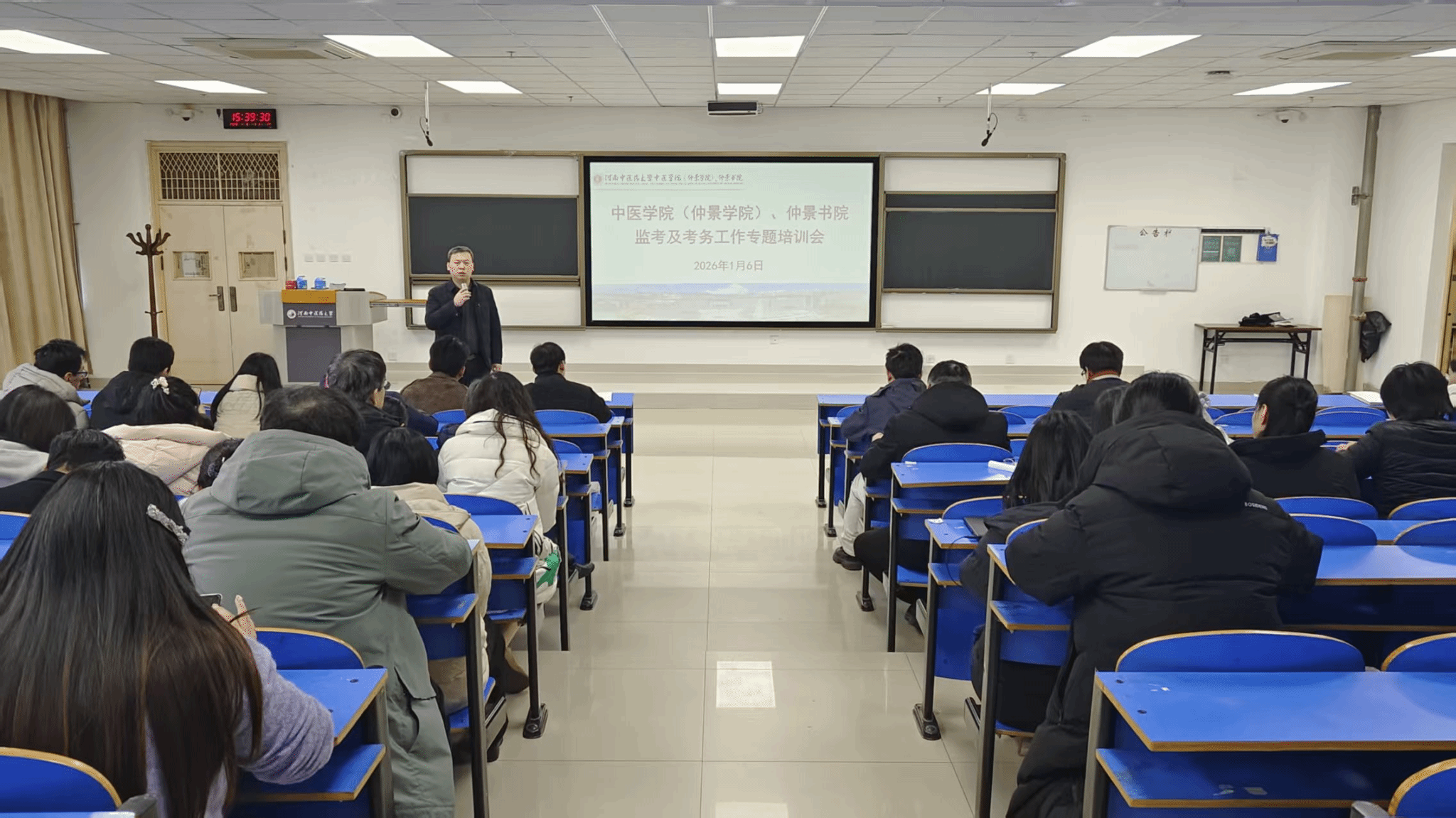 本网讯(文/图 齐水水)为进一步规范期末考试管理,保障考试工作有序开展,2026年1月6日下午,蘑菇视频 、仲景书院在综合教学实验楼A334召开2025-2026学年第一学期期末考试监考及考务工作专题培训会,副院长刘文礼、学院全体教职工及全体研究生参会。